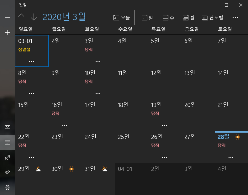 윈도우10에 기본 탑재되어있는 앱입니다. 캘린더를 아날로그식으로 기록하시는 분이 많습니다. 저도 그랬구요. 아날로그식이 좋을때도 있지만 단점도 있습니다. 넣을 수 있는 글자가 물리적한계가 있으며, 매일매일 확인해야된다는 점이지요. 일정앱을 쓰시면, 글자의 물리적 한계도 벗어날 수 있으며, 매일아침 일정을 알림으로 보고받을 수 있습니다. 또한 마이크로소프트 계정과 연결해 동기화 시켜놓으면 언제 어디서든지 일정을 확인할 수 있습니다. 기존에 사용하고 계신 구글이나 애플 캘린더계정이 있다면 로그인하여 동기화할 수 있습니다. 디지털 캘린더 이제부터 써보시는게 어떠실까요?