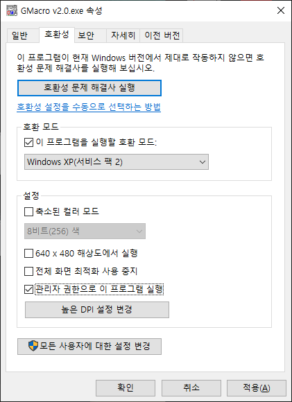 상단 설정에 키보드설정, 마우스 설정에서 단축키를 미리 정해주시는게 좋습니다. 잘안쓰는 키를 단축키로 설정하세요. 또 매크로 프로그램이 열리지 않거나, 응답없음이 뜬다면 속성에 들어가서 호환성에 '호환모드'를 켜서 Windows7이나 XP모드로 실행하시고 관리자 권한으로 이 프로그램 실행에 체크해주세요. 프로그램이 오래되다보니 윈10에서 열리지않는 경우가 있습니다.