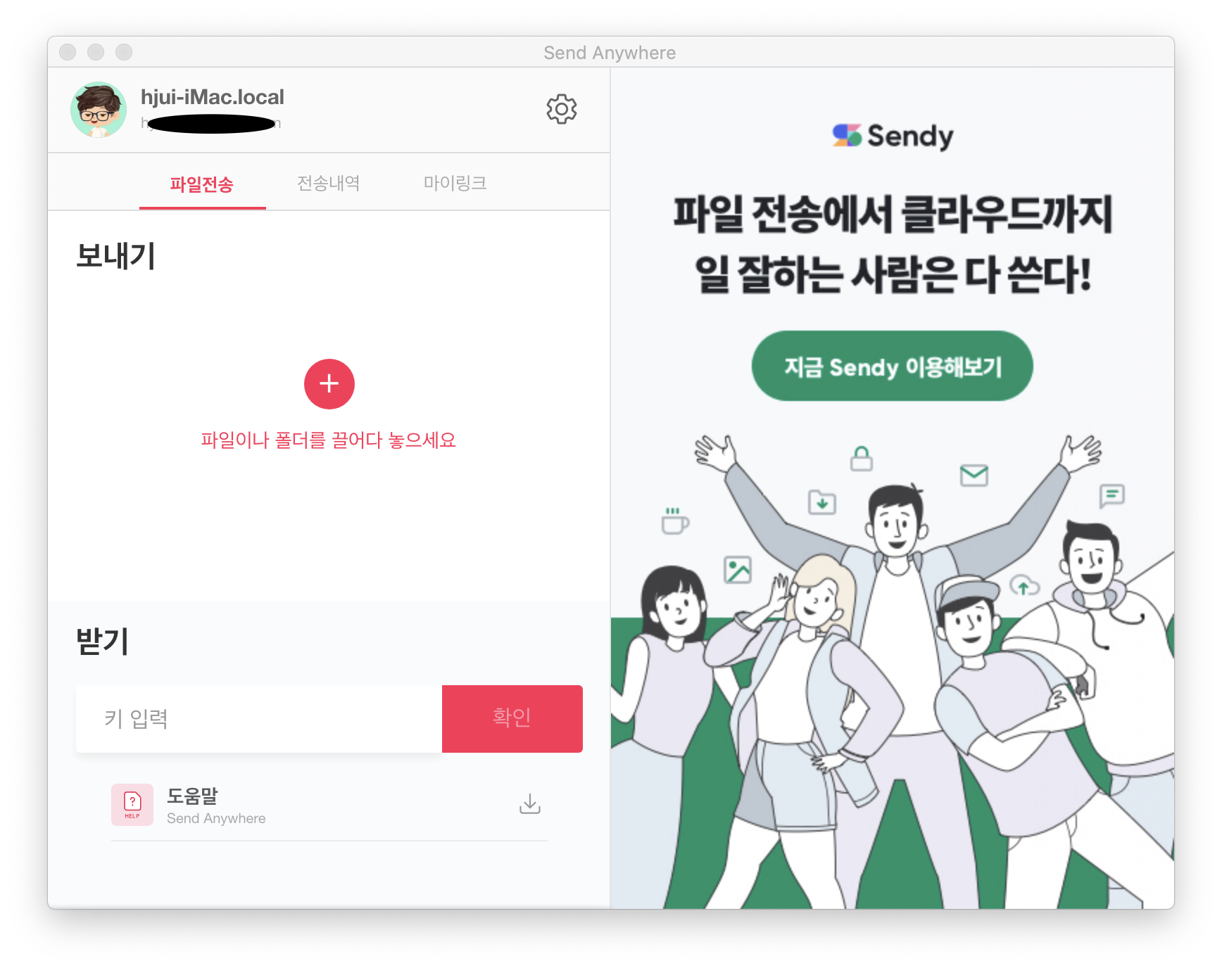아이폰을 쓰신다면 맥과 데이터교환은 에어드롭으로 이미 충분하실 겁니다. 하지만 폰은 안드로이드폰과 맥을 사용하시는 분들께는 파일전송 프로그램은 하나씩을 사용하실건데요. 샌드애니웨어 쓰시면 됩니다. 숫자 6자리만 입력해놓으면 전송받으실 수 있고요. 계정연결 해놓으면 '도움말' 부분이 보낸 파일로 변경되고 숫자 입력하지않고 그냥 받기 부분에서 다운로드 버튼만 누르면 됩니다. 에어드롭도 가끔씩 오류가 발생하는 경우가 있으니, 그때 샌드애니웨어 쓰시면 더 좋습니다. 그리고 이건 팁인데요. 다른 분께 파일전송하실 때는 eoq.kr/숫자6자리 입력하고 링크로 보낼 수 있습니다. eoqkr를 한글로 써보시면 쉽게 기억할 수 있습니다.