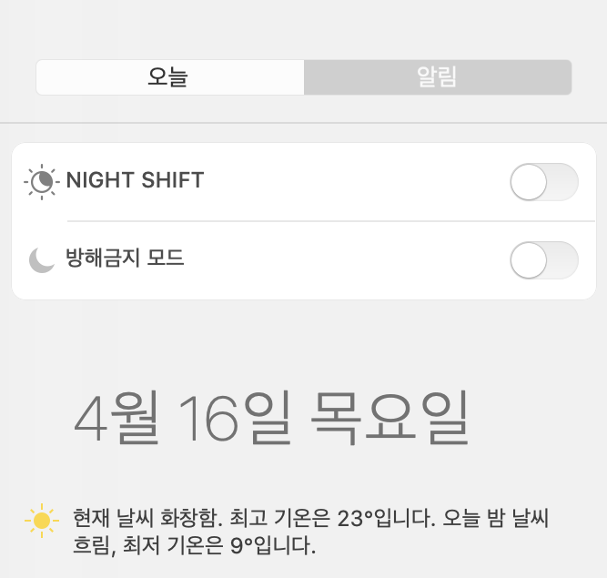 알림센터를 내려보세요. 그러면 나이트 쉬프트와 방해금지모드를 켜고 끌 수 있습니다. 나이트 쉬프트 켜면 눈이 조금 덜 아픈 느낌적은 느낌입니다.