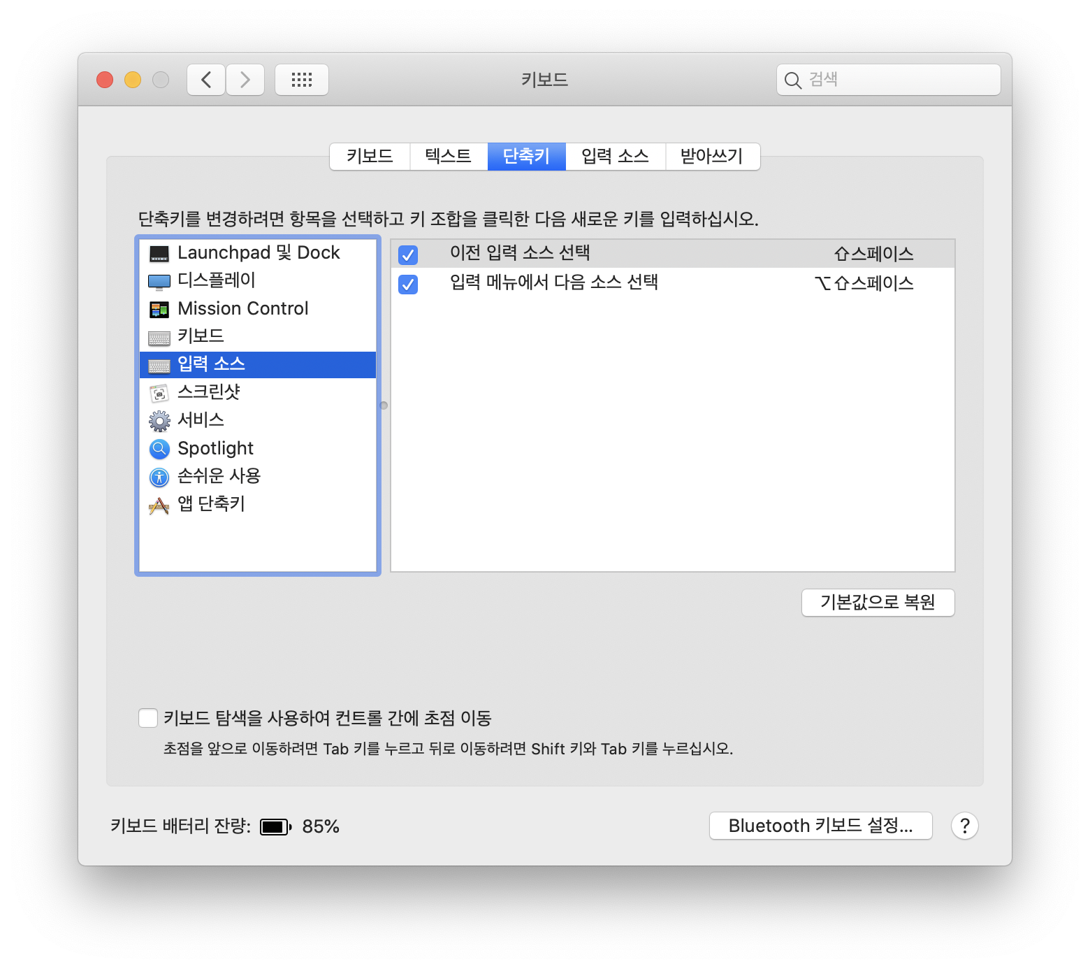 * 입력소스 전환방식을 ⇧스페이스를 사용하시려면 반드시 fn키를 누르고 변경하셔야 합니다.