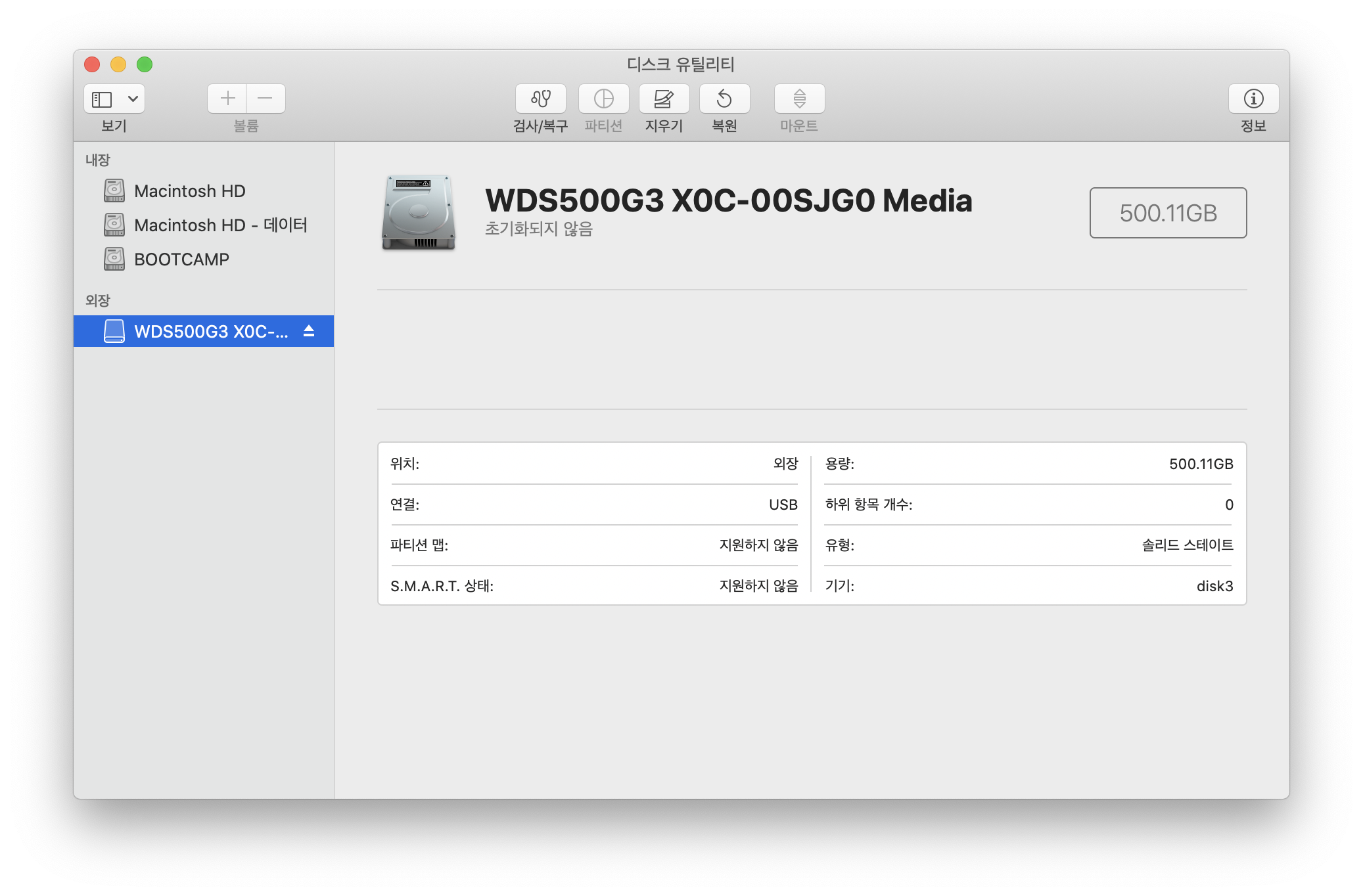 꽂으면 장착한 SSD의 브랜드 이름이 뜨실거예요. 상단에 지우기 버튼을 클릭하세요.