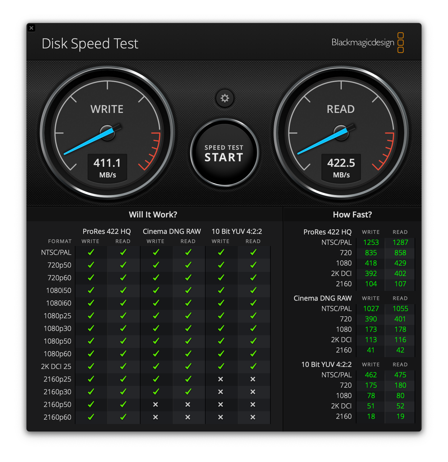 속도는 읽기/쓰기 400MB/s 정도 나옵니다. USB 3.1 Gen2를 지원하는 기기라면 이거보다 훨씬 빠른 속도로 처리할 수 있을것 같습니다. 제 아이맥은 2015라 USB 3.0까지 밖에 지원이 안됩니다.