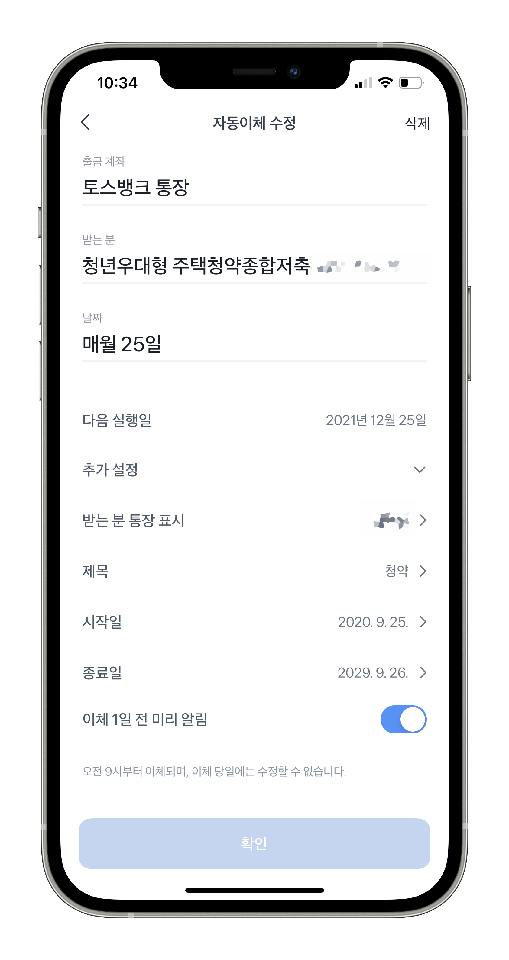 두번째, 자동이체하는 날짜가 영업일이 아니거나 공휴일이면 자동이체가 밀립니다. 제대제때 넣어야하는 월세 같은경우에 이렇게 되면 약간 곤란한적이 다들 있으실텐데요. 토스는 송금을 예약거는 시스템이라 영업일이 아니더라도 지정한 날짜에 정확하게 이체 됩니다.